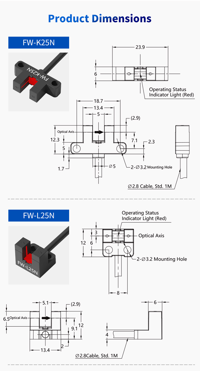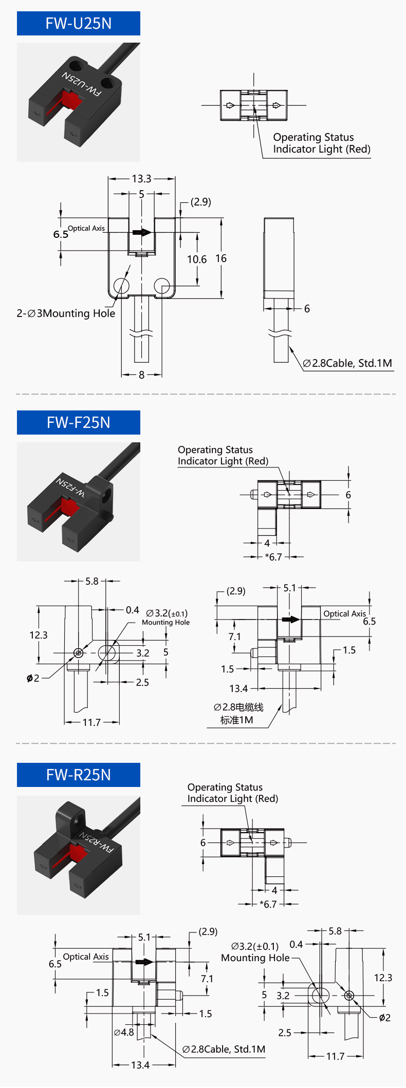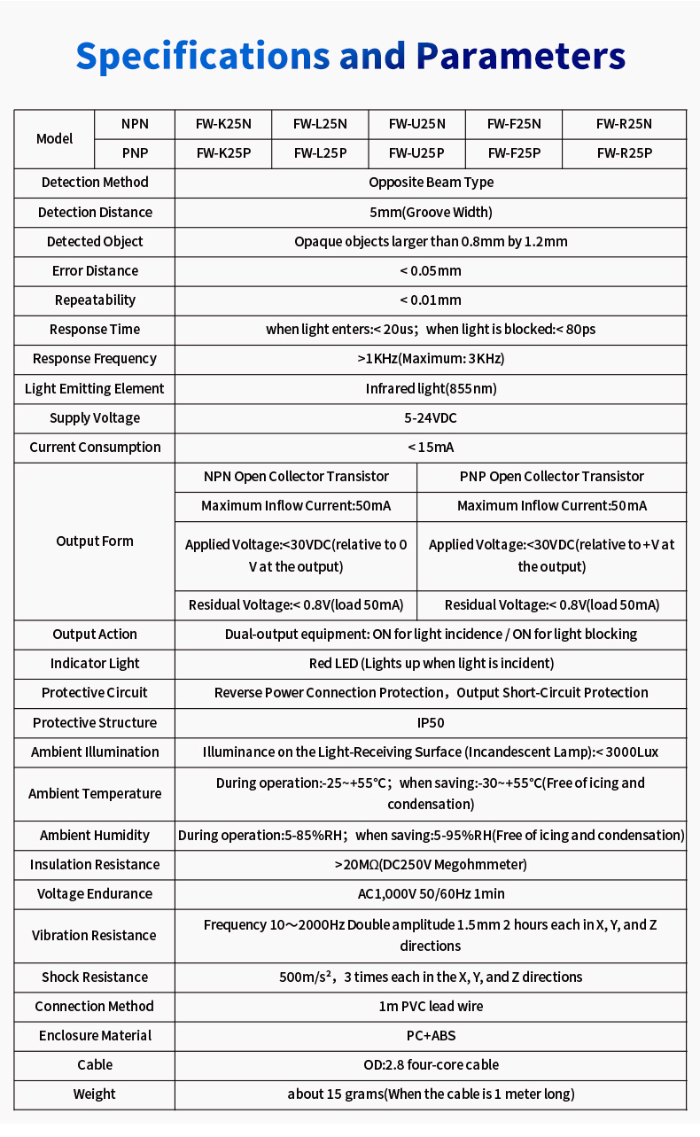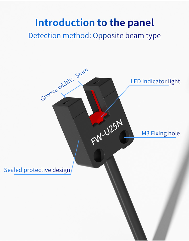 Meta Description: Scopri il sensore fotoelettrico con scanalatura a U serie FW25 con un'ampiezza di rilevamento di 5 mm. Dotato di chip intelligente, alloggiamento integrale e stili versatili per il rilevamento dell'origine, il monitoraggio della velocità di rotazione e il controllo della guida. Ideale per robuste applicazioni di automazione industriale.