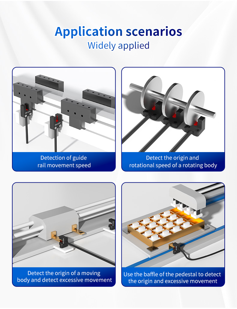La versatilità del sensore con scanalatura a U FW25 lo rende un componente di riferimento in numerosi settori, tra cui imballaggio, movimentazione dei materiali, lavorazione CNC e automazione dell'assemblaggio. Rilevamento della velocità di movimento della guida: nei sistemi di movimento lineare, una bandiera montata su un carrello in movimento può passare attraverso la scanalatura a U. Contando gli impulsi nel tempo, l'FW25 può calcolare con precisione la velocità lineare del binario di guida, consentendo il monitoraggio e il controllo della velocità. Rileva l'origine e la corsa eccessiva di un corpo in movimento: il sensore è perfettamente adatto per le sequenze di homing. Una linguetta su un attuatore lineare o un braccio robotico passa attraverso la scanalatura, fornendo un preciso segnale di "ritorno" o "origine" al controller. Inoltre, è possibile posizionare un secondo sensore alla fine della corsa per rilevare la corsa eccessiva, prevenendo danni meccanici e garantendo la sicurezza operativa. Rilevamento dell'origine e della velocità di rotazione di un corpo rotante: montare una linguetta singola o una ruota a più denti su un albero rotante. Quando ciascuna linguetta passa attraverso la scanalatura da 5 mm, l'FW25 genera un impulso. Un singolo impulso per giro fornisce i dati sull'origine, mentre più impulsi consentono un calcolo accurato della velocità di rotazione (RPM), essenziale per il controllo del motore e il monitoraggio del processo. Utilizzo con deflettori della staffa di montaggio per il posizionamento: molti sistemi utilizzano deflettori semplici e fissi. L'FW25 può essere abbinato alla staffa di montaggio o ad dispositivi personalizzati per rilevare la presenza o la posizione di questi deflettori, creando un sistema di commutazione di limite semplice ed economico.