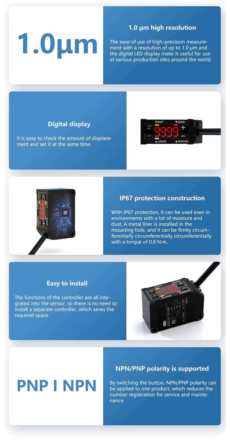 In termini di precisione di misurazione, questo sensore funziona anche eccezionalmente bene. Raggiunge una precisione lineare di ± 0,1% F.S. (su vasta scala) e accuratezza della ripetibilità fino a 1 μm, garantendo coerenza e accuratezza nei risultati di misurazione multipla. Sia per l'ispezione dimensionale di componenti di precisione o l'allineamento posizionale nelle linee di produzione automatizzate, soddisfa le esigenze di misurazione ad alta precisione.