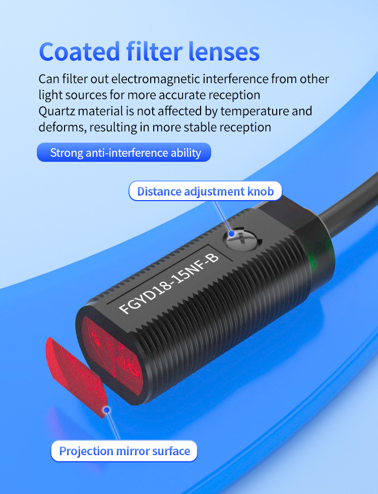 La parte frontale del sensore presenta una lente filtro rivestita che filtra efficacemente la luce randagio e l'interferenza elettromagnetica dall'ambiente, garantendo una ricezione del segnale accurata e stabile. Realizzato in materiale al quarzo, l'obiettivo resiste al alte temperature e alla deformazione, mantenendo prestazioni eccezionali anche in ambienti con fluttuazioni di temperatura significative. Questo design migliora ulteriormente l'affidabilità dei sensori di rilevamento della macchina a molla in condizioni operative difficili.