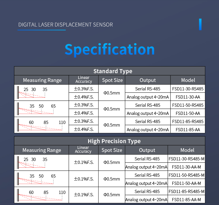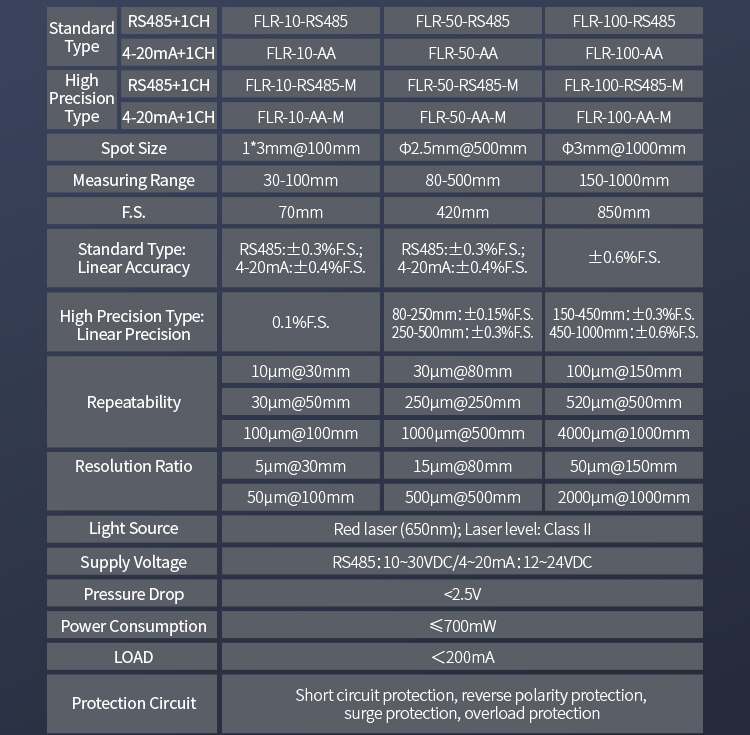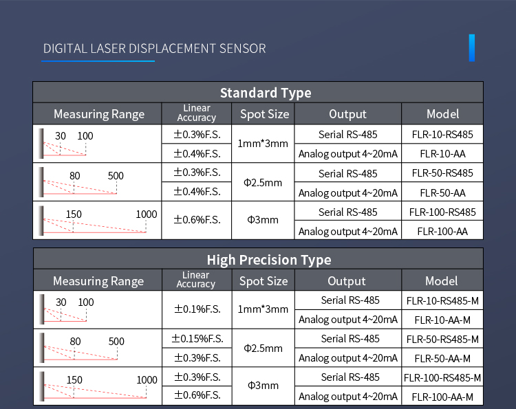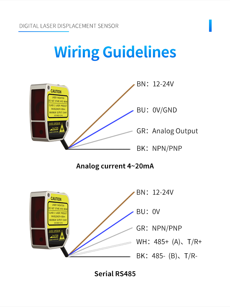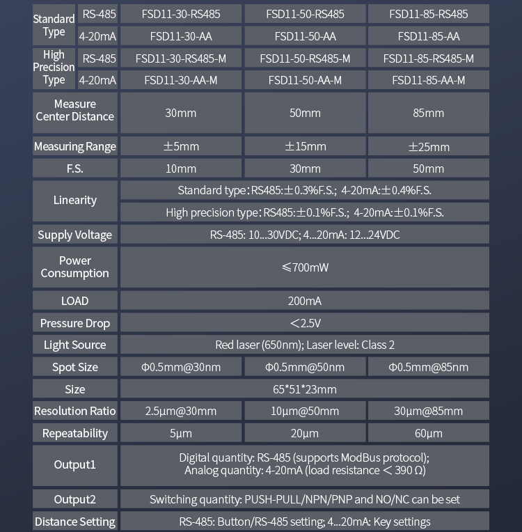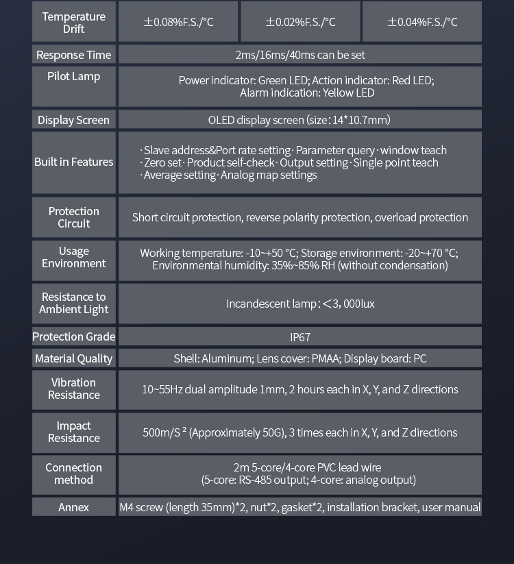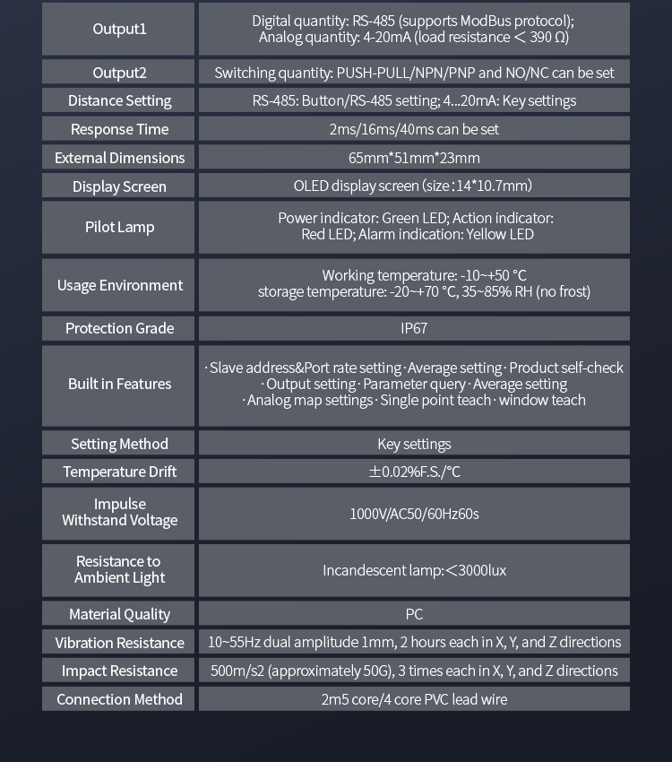 L'impostazione del doppio pulsante consente la selezione flessibile di un intervallo da 10 a 850 mm, con uscita di commutazione e uscita di corrente analogica, nonché uscita di comunicazione RS485, per soddisfare varie esigenze di utilizzo.