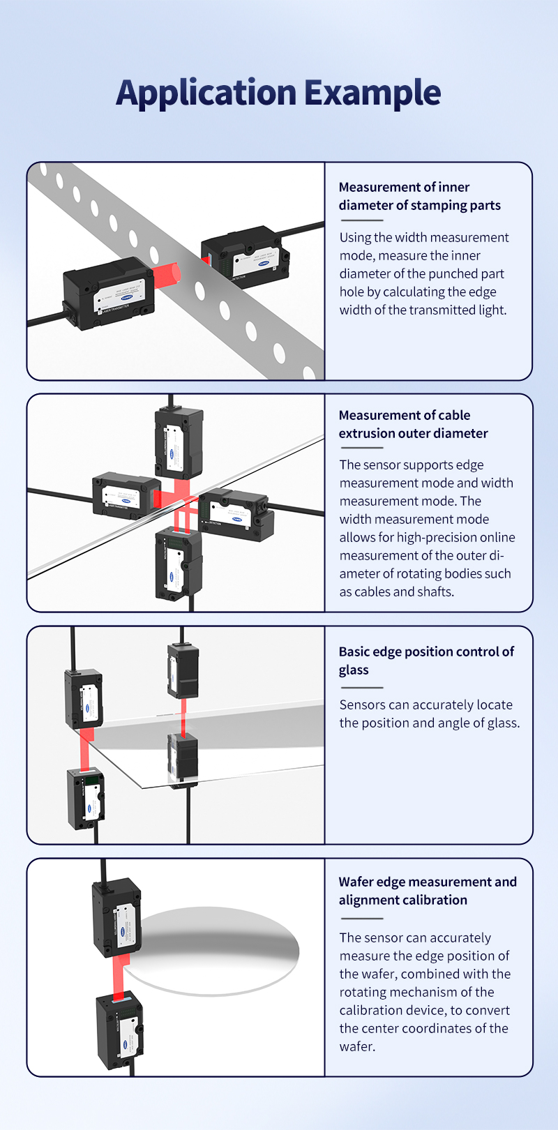 Posizionamento del bordo del wafer e deskew di avvolgimento: per la produzione di semiconduttori, il design miniaturizzato del sensore può essere incorporato in spazi stretti e il punto da 14*12 mm identifica accuratamente il contorno del wafer.