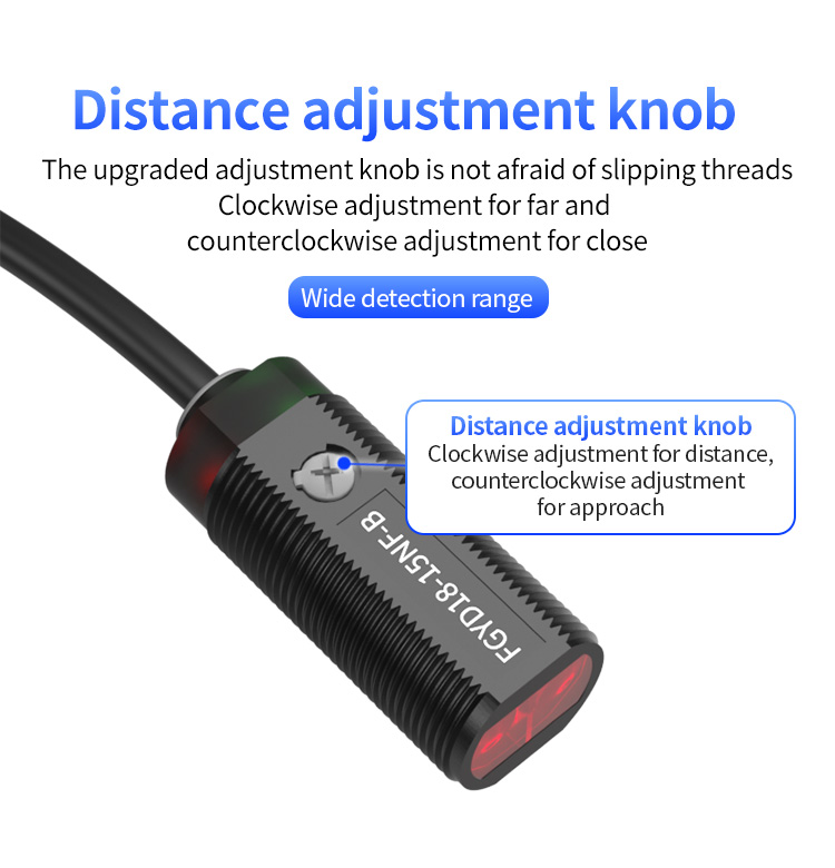 Inoltre, la distanza di rilevamento regolabile di 150 mm si distingue come un'altra caratteristica chiave. La serie FGYD18 offre una regolazione della gamma di rilevamento flessibile tra 20-150 mm. Gli utenti possono facilmente impostare la distanza desiderata tramite una manopola di regolazione di alta qualità. Questo design garantisce prestazioni stabili e durata estesa, posizionandolo come sensore fotoelettrico di precisione di alto livello. Nell'ispezione automatizzata, il controllo preciso della distanza è fondamentale, sia per il posizionamento degli oggetti delicati o le operazioni della catena di montaggio ad alta velocità, questo sensore fornisce una risposta coerente. Immagina di raggiungere un rilevamento efficiente su centri di lavorazione a mezzi anticipali o macchine utensili senza frequente ricalibrazione: questo indubbia risparmia sia tempo che costi.